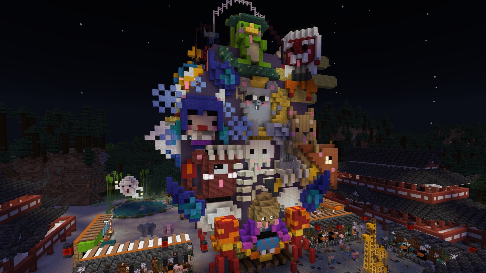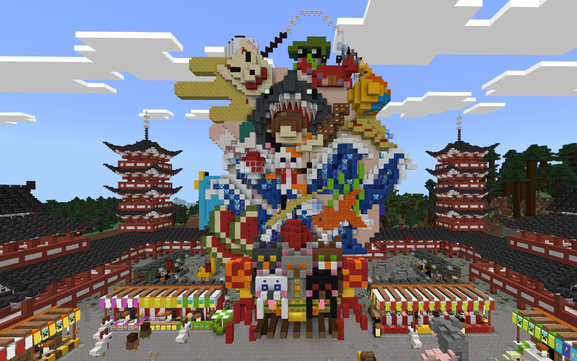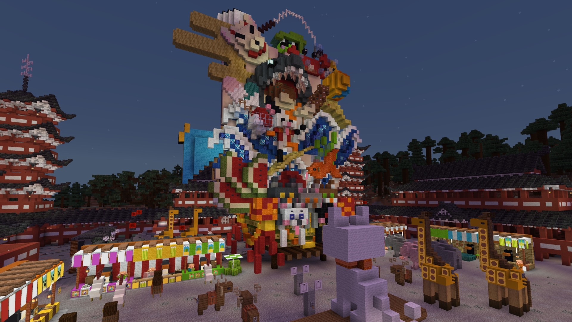 昼は動物たちのお神輿でかわいく賑やか、夜は「動物百鬼夜行」のお神輿として妖しく光る――その対比が本当にお見事! 神輿の正面と背面で対になるモチーフを見比べたり、お祭りを楽しむ動物たちが何をしているのか想像したり… お祭りの賑わい、屋台の人々の様子、夜の幻想的な空気感などすべてが丁寧に表現されていて、見るたびに新しい発見がある作品です。