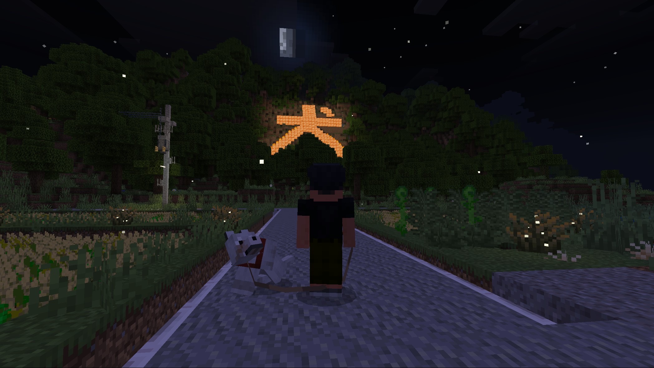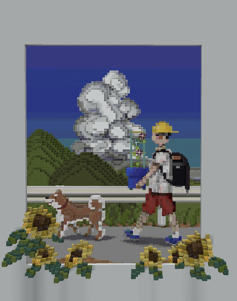 大文字焼きならぬ「犬文字焼き」おもしろい! 送り火の光と、こちらを見つめるわんちゃんの姿がなんとも愛おしく、夏の終わりのちょっと切ない雰囲気の表現が素晴らしいです。 「犬」の文字が目立ちますが、風景の作りこみも細部まで丁寧で技術と感性の両方が光る作品です。