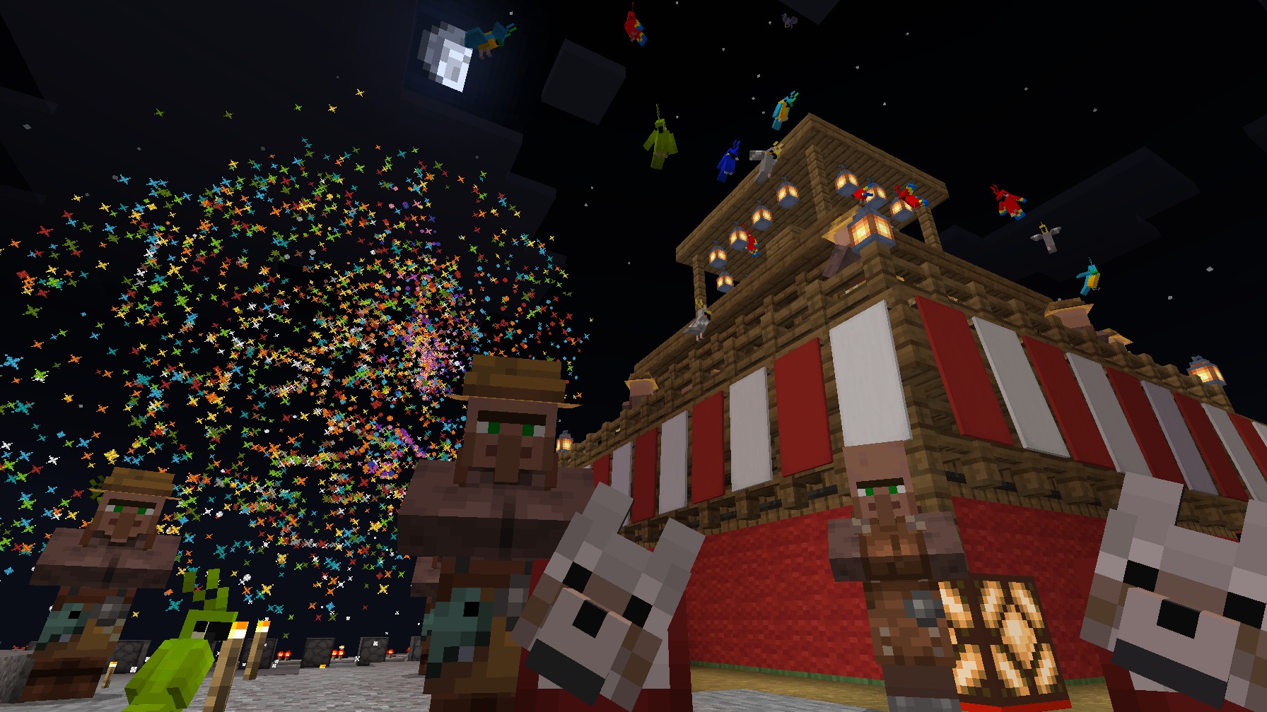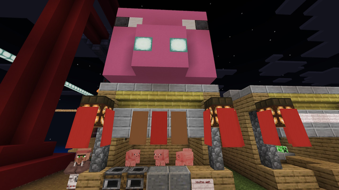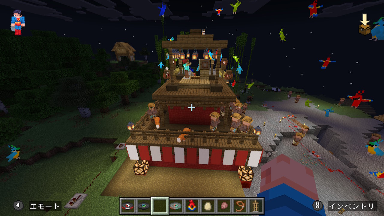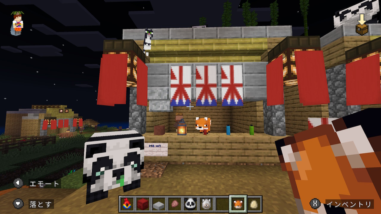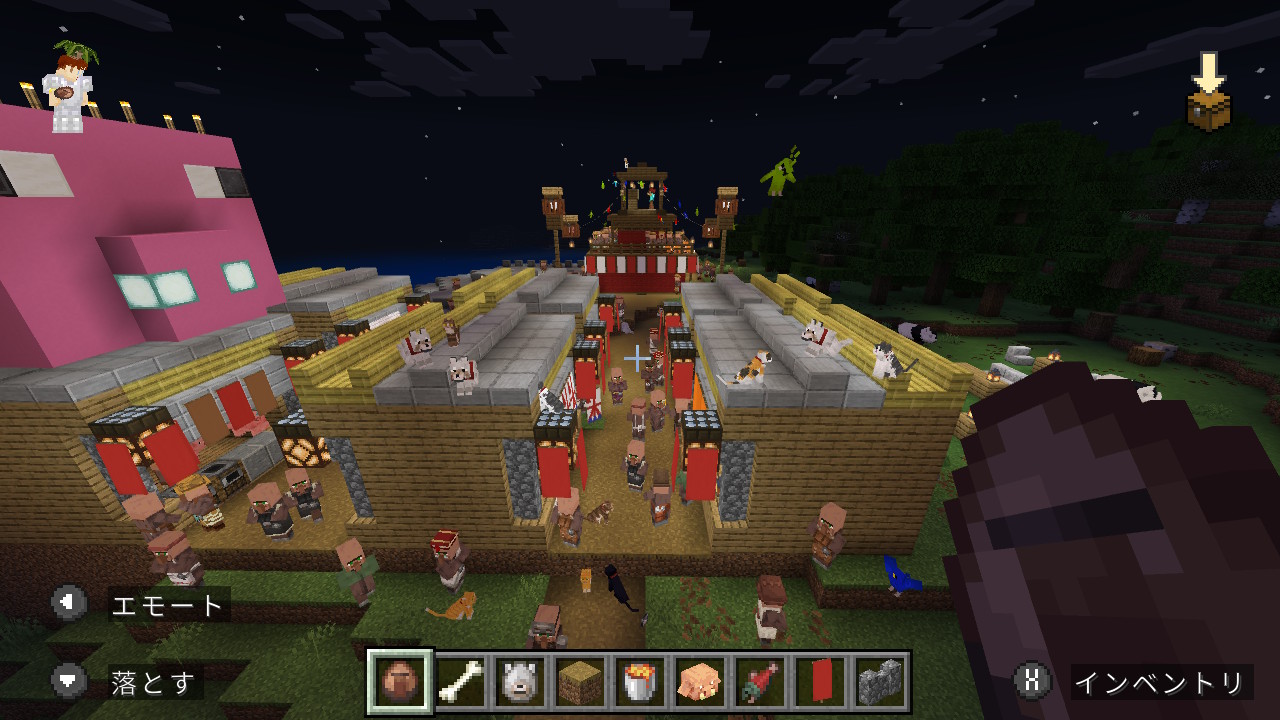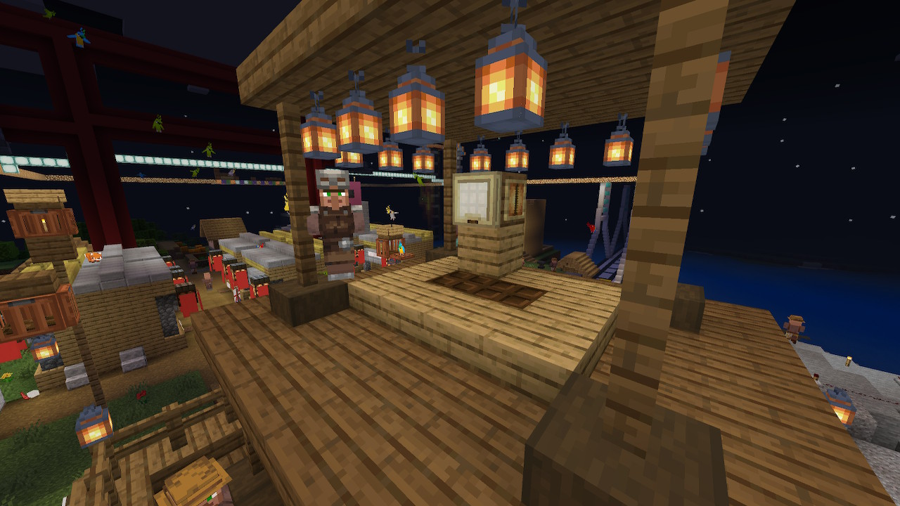 村人も動物も楽しそうで、賑やかさの表現がとても上手だと思いました。出店ややぐら、かき氷ののれんなど細部までこだわって作られています。フランクフルト屋の豚など、ちょっとシュールな遊び心もナイスでした!